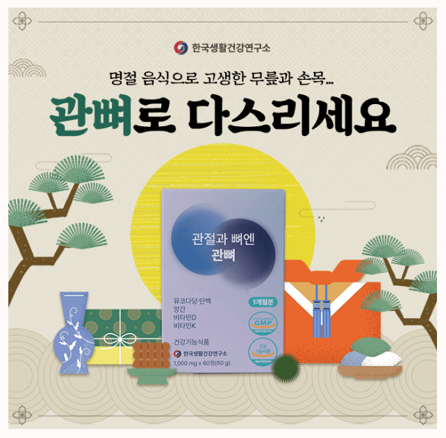 추석때 정말 고생 많으셨어요. 쉼없이 움직인 관절과 뼈를 관뼈가 돌봐드릴게요. 식약처 건강기능식품 9가지 기능성 인정 완료! 합리적인 가격+고기능성 제품만 출시하는 한국생활건강연구소 '관절과 뼈엔 관뼈' 특가 3~70대 대상 인체시험결과 계단 내려갈때의 불편함 개선 확인 OO 관절 통증 개선 확인 소비기한: 2026년 7월